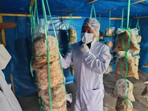 Entre estas acciones destacan los fitotoldos para hortalizas —pequeños invernaderos protegidos con plástico agrícola que permiten cultivar durante todo el año, incluso en condiciones climáticas adversas— y la producción de hongos, actividades que contribuyen tanto a mejorar la alimentación familiar como a generar ingresos adicionales.